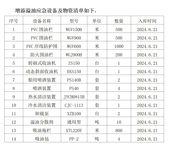 為了更高效地應(yīng)對溢油事故,我司新增購置了一批先進的溢油應(yīng)急設(shè)備和物資,包括吸附材料、圍油欄、收油機等,以提高我司在溢油應(yīng)急處理中的清除效率和效果。